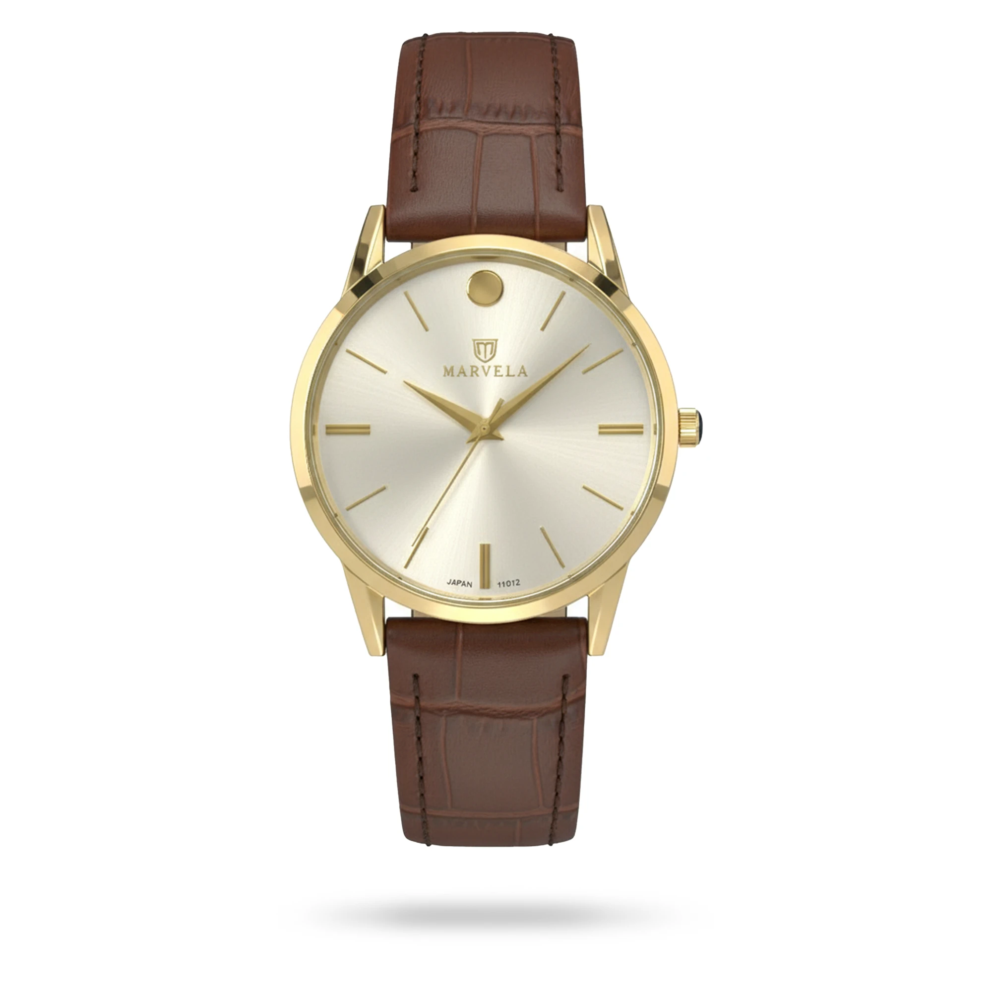 ساعت مارولا مردانه کد MR11012G-0001، ساعتی بسیار زیبا با رفرانس 11012، از نوع کلاسیک بوده و جنس بند آن، چرمی می باشد. رنگ قاب این محصول، طلایی، رنگ بند آن قهوه ای و رنگ صفحه آن سیلور بوده و استایلی زیبا برای شما فراهم می کند.