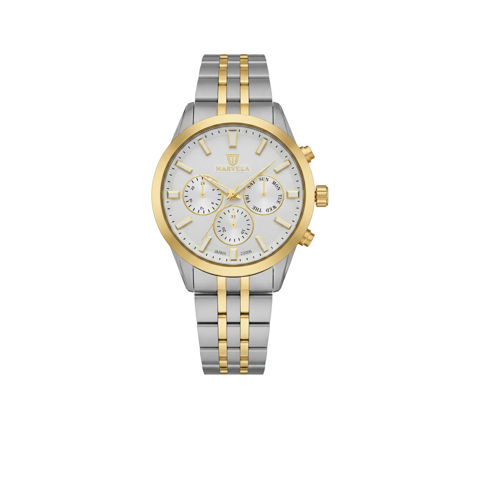 ساعت مارولا زنانه کد MR22006L-0003، ساعتی بسیار زیبا با رفرانس 22006، از نوع کرونوگراف بوده و جنس بند آن، فلزی می باشد. رنگ قاب این محصول، استیل طلایی، رنگ بند آن استیل طلایی و رنگ صفحه آن سیلور بوده و استایلی زیبا برای شما فراهم می کند.