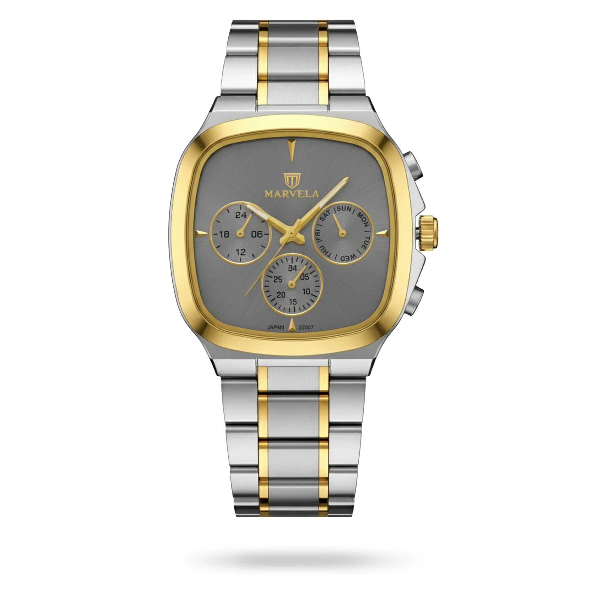 ساعت مارولا مردانه کد MR22007G-0017، ساعتی بسیار زیبا با رفرانس 22007، از نوع کرونوگراف بوده و جنس بند آن، فلزی می باشد. رنگ قاب این محصول، استیل طلایی، رنگ بند آن استیل طلایی و رنگ صفحه آن طوسی بوده و استایلی زیبا برای شما فراهم می کند.