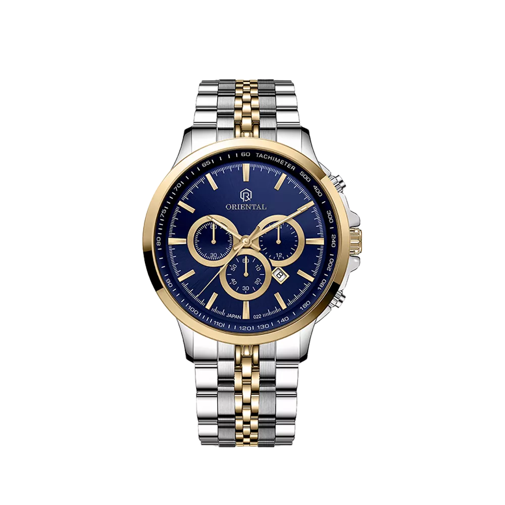 ساعت اورینتال مردانه کد O.SH022G-0101 ، ساعتی بسیار زیبا با رفرانس 022 ، از نوع کرنوگراف بوده و جنس بند آن، فلزی می باشد. رنگ قاب این محصول، استیل طلایی، رنگ بند آن استیل طلایی و رنگ صفحه آن سرمه ای بوده و استایلی زیبا برای شما فراهم می کند.
