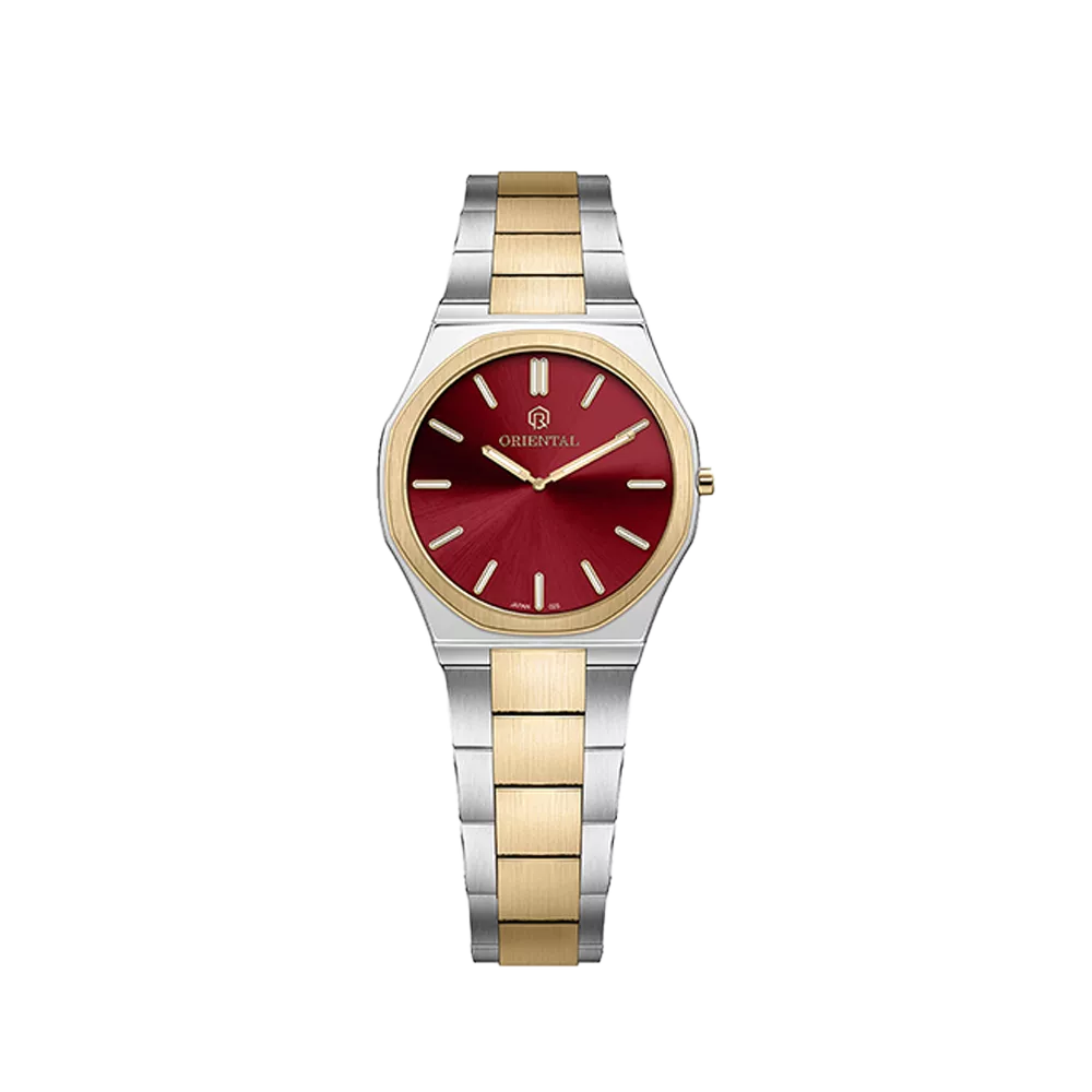 ساعت اورینتال زنانه کد O.SH025L-0414 ، ساعتی بسیار زیبا با رفرانس 025 ، از نوع کلاسیک بوده و جنس بند آن، فلزی می باشد. رنگ قاب این محصول، استیل طلایی، رنگ بند آن استیل طلایی و رنگ صفحه آن زرشکی بوده و استایلی زیبا برای شما فراهم می کند.