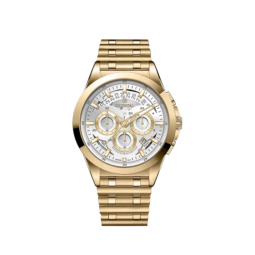 ساعت اورینتال مردانه کد O.SH271G-0001 ، ساعتی بسیار زیبا با رفرانس 271 ، از نوع کرنوگراف بوده و جنس بند آن، فلزی می باشد. رنگ قاب این محصول، طلایی، رنگ بند آن طلایی و رنگ صفحه آن سیلور بوده و استایلی زیبا برای شما فراهم می کند.