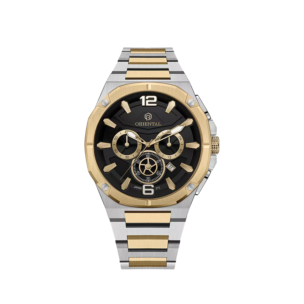 ساعت اورینتال مردانه کد O.SH272G-0023 ، ساعتی بسیار زیبا با رفرانس 272 ، از نوع کرنوگراف بوده و جنس بند آن، فلزی می باشد. رنگ قاب این محصول، استیل طلایی، رنگ بند آن استیل طلایی و رنگ صفحه آن مشکی بوده و استایلی زیبا برای شما فراهم می کند.